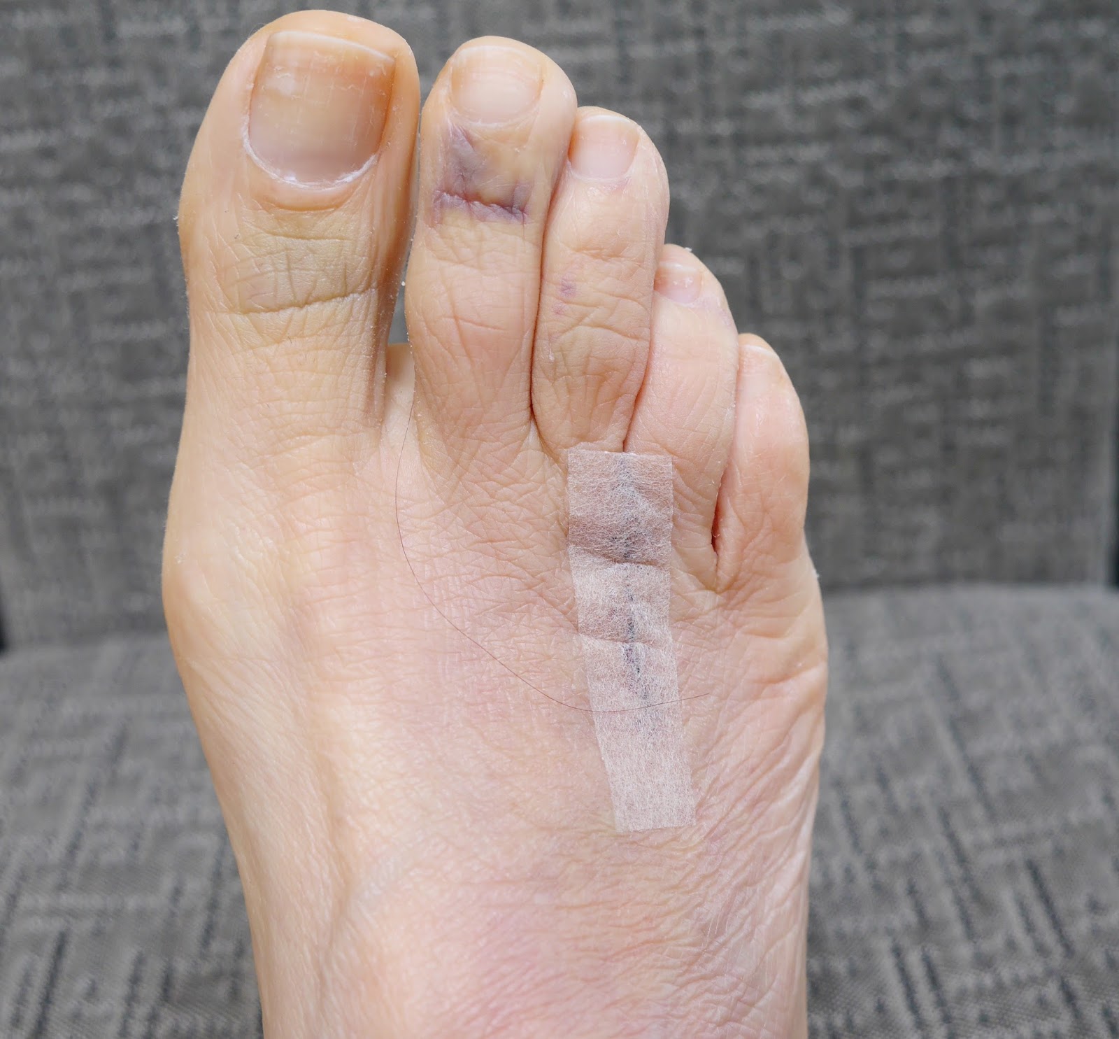 | A few days after surgery. Even the unaffected toes were black and blue. |